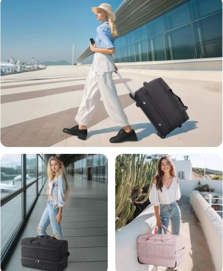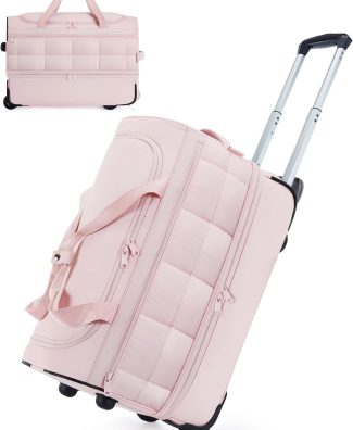 40L Rolling Duffle Bag with Wheels and Handle, TSA Underseat Carry On Bags for Travel with Shoe Compartment, Pink
